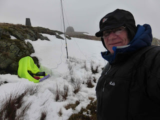 This route is about 3 miles to the summit which includes the zig-zag in the forestry. It was a ‘little muddy’ but I was delighted that my route was on a resurfaced track which took me to the gate leading onto the moorland at SN85155625. As soon as you go through the gate you must turn left immediately and head NNE skirting SE of Drygarn Fach. By the time I arrived at the gate the mist had come down and it started to drizzle with rain.... one of those activations then. With GPS in hand, a GPX track from last year but also keeping an eye on the compass I made my way towards the summit following the vague outline of the farmer’s Quad bike trail until I hit the snow!...